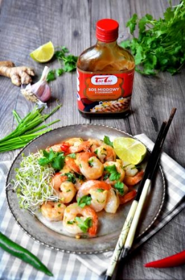 Oczyszczone, rozmrożone (jeśli korzystamy z mrożonych) krewetki zalewamy sosem miodowym i odstawiamy na 30 minut.